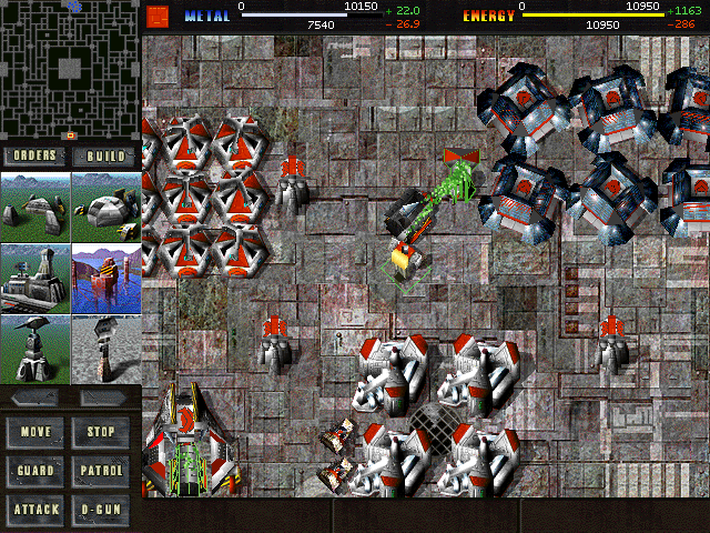 The player can command a variety of units from fighter and bomber aircraft, to tanks and mechs, to ships and submarines. Given their robotic nature, units are self-contained with no limiting factors such as fatigue, fuel or morale. Units can vary in size, speed and the ability to give and take damage, generally depending on their tech level. One praised feature of the game's units are their hierarchical proportionality— that is, an advanced unit being equal in combat terms to many weaker units, but taking a proportionately longer time to build. Each unit has strengths and weaknesses, optimal styles of use, and corresponding units against which it is vulnerable or well-suited. Effective play is usually characterized by consideration of these attributes, as well as efficient resource management, strong defenses, and knowledge of the opponent's strategies. The game's interface consists of construction and command buttons (depending on the unit selected), unit status information, resource information on the production of Energy and Metal, and a minimap which gives an overview of the game's battlespace— the visibility of which may be hindered by fog of war, necessitating the use of radar or scout units. There are a few highly-advanced units which are invaluable combat-wise, such as nuclear missile launchers which have unlimited range and very high damage. There are two story-related factions which, while aesthetically different, have a similar set of units.